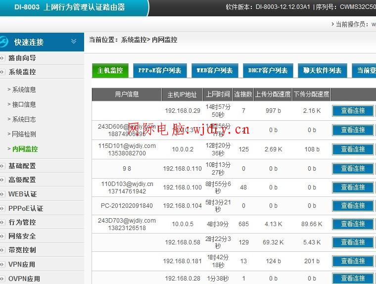 « 什么软件能够检测出同一局域网内有多少台电脑上网 弱电服务公司 发布于 2013-6-30 12:51 阅读:11146 办公运维服务 好一点网络路由器都有这个功能!看网际电腦民治店的路由器是DI-8003上网行为管理认证路由器 就有内网监控这个功能;可以看到上网在线人数及上网分配速度等等!我截个图片分享一下! 如果你路由没有管理功能可以考虑手p2p软件!不建议你用! 请先 登录 再评论 输入验证码