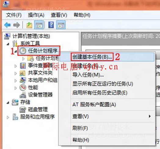 第2步、在弹出的电脑管理窗口,使用鼠标左键单击左侧的“任务计划程序”使其为选中状态,然后再点击鼠标右键弹出菜单并选择“创建基本任务(B)…”。如下图所示: