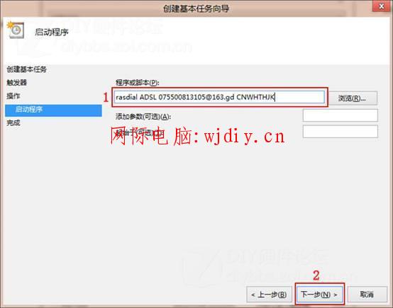 第6步、在启动程序或脚本设置界面,在标注“1”位置处键入“rasdial ADSL 075500813105@163.gd CNWHTHJK”,然后在标注“2”处点击“下一步(N)”按钮。如下图所示: