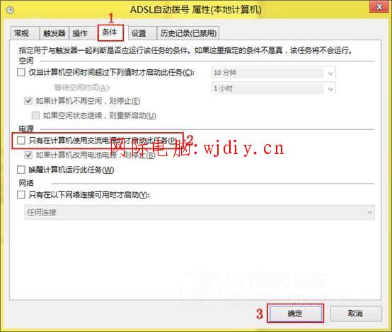 第9步、在弹出的属性设置窗口,点击“条件”选项卡,取消勾选“只有在电脑使用交流电源时才启动此任务(P)”,最后点击“确定”按钮结束设置。如下图所示: