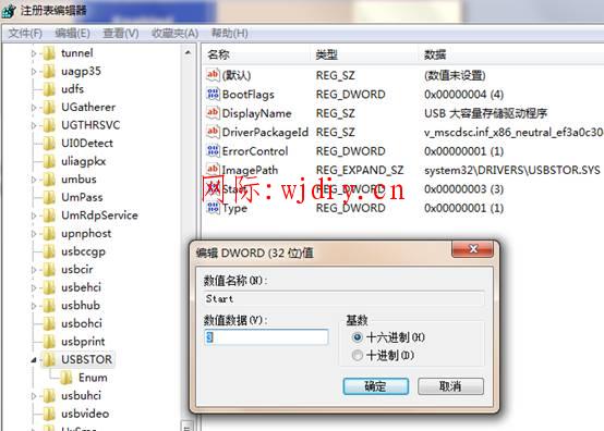 检查注册表,我们可以通过在运行命令中输入"regedit",打开系统的注册表编辑器,打开“HKEY_LOCAL_MACHINE\SYSTEM\CurrentControlSet\Service\USBSTOR”找到里面的start项,注意看下选项的值。如果值为4,则说明USB等外接设备已经被注册表禁用了,要想解决也很简单,只需要将该项值调为3即可。