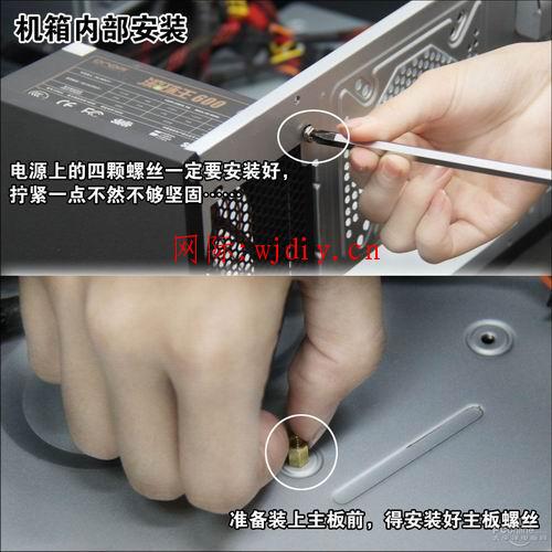 安装好主板上得CPU、散热器和内存后,接下来需要把电源、主板硬盘安装在机箱上。