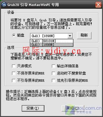 这里要说明一下,在“设备”里有两个选项,一个是电腦的硬盘,一个是要制作的U盘。这里一定要选对U盘而别选错硬盘,从大小就能分出来哪个是U 盘。笔者的U盘是2G的,所以应该选择(hd1)[1898M]。下面的“选项”部分可以不用管,默认不勾选任何参数就行。确认好以上步骤后,点“安装” 然