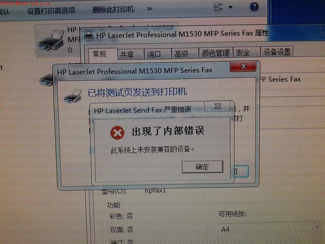 上门修打印机时打印机打印时出现了内部错误,提示系统上未安装兼容的设备这是怎么回事啊?   试了下把打印机电源关掉重启也不行!这台是网络打印机没有找远程设置!出现如下图:出现了内部错误,系统上未安装兼容的设备。