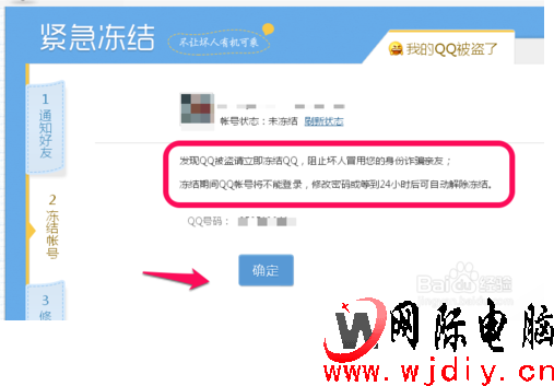 确定后,我们的QQ就紧急冻结成功,点击确定就可以了,如图。