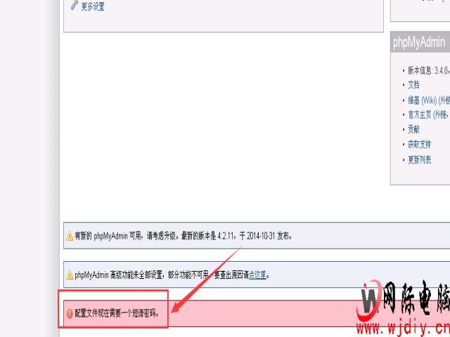 再次登陆phpmyadmin,刷新一下试试,红色的提示信息已经消失了!