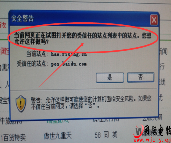 我去秋瑞大厦修电腦;客户电腦在使用浏览器(IE内核浏览器)上网的时候会遇到这么一个安全警告。“当前网页正在试图打开您的受信任的站点列表中的站点。您想允许这样子做吗?”如下图: