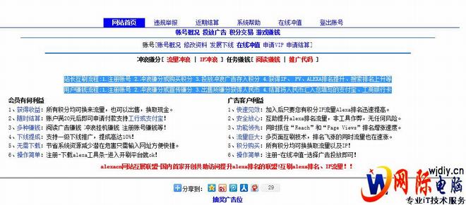 站长互刷流程:1.点.注册账号 2.冲浪赚分或购买积分 3.投放冲浪广告存入积分 4.获得IP、 PV、ALEXA排名提升、搜索排名上升等