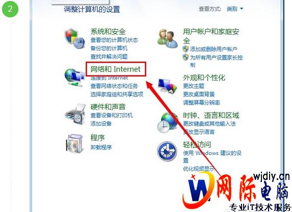 在控制面板设置窗口里 点击“网络和Tnternet” 如图