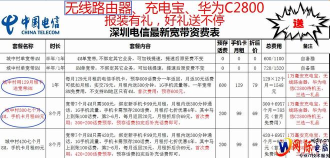 城中村300七个月4M,手机卡月租69元:宽带7个月4M只需300元,绑定新手机卡99元月租,月租内送300分钟通话,1G手机流量。手机卡需预存200话费,月租打七折优惠4年。其中马上到账100话费,第2-6月,每月返回20元,月租折后价69元。首次费用:300+200话费预存,预存话费扣完后补充话费即可。1万毫安充电宝,无线路由器,华为电信C2800待机王。 三选一礼品 如上图