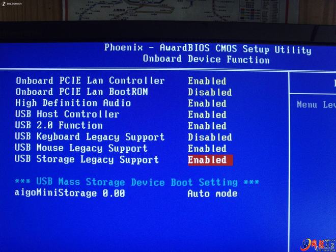 注意把图中高亮部分设置为Enable,保存BIOS后,重新启动,再次进入BIOS设置,回到这个菜单的时候,就可以在最下面一行看到U盘已经被识别出来了
