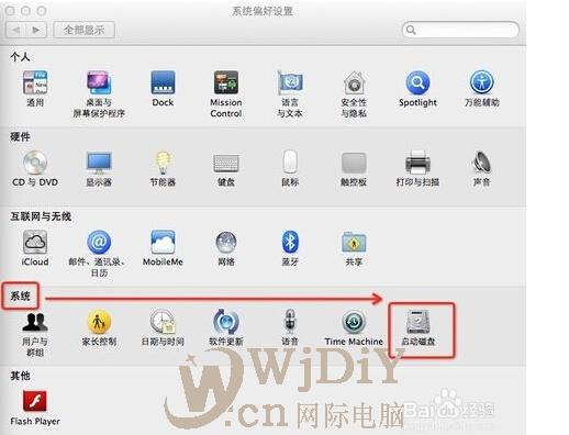 进入“系统偏好设置”界面,选择“系统”栏目->“启动磁盘”。