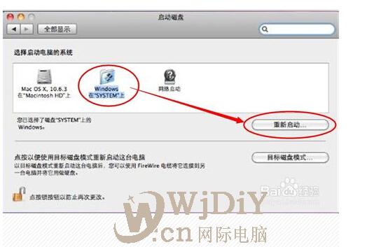 在弹出的启动磁盘对话框里选择“windows磁盘”,再点击下面的“重新启动”按钮。再进入系统的时候就是windows系统。
