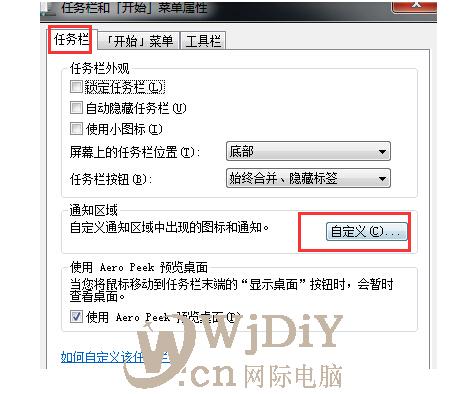 2.在任务栏的属性窗口中,咱们切换到任务栏这一项中,然后找到下方的通知区域,点击后面的自定义按钮。