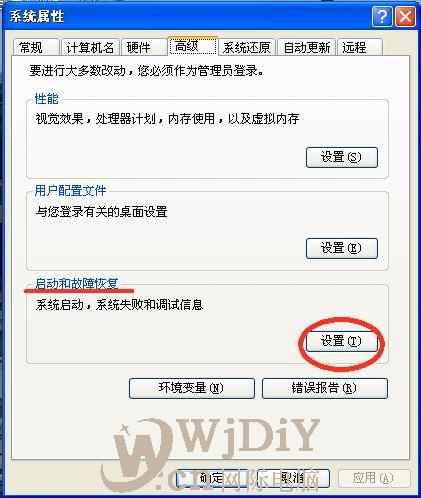 3,在高级属性窗口,点“启动和故障恢复”项之“设置”: