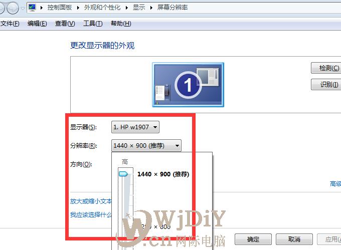 如下图,点击分辨率列表框,可以看到当前显示分辨率支持情况,选择后点击确定即可。