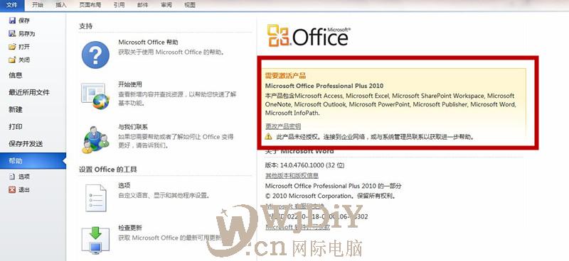 点击左上角的文件选项里的帮助可以看到刚刚安装的office还没有激活,那么如何让激活该产品呢?可以到网上下载一个激活工具即可激活,