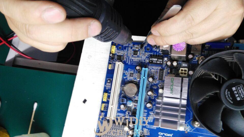 电腦usb接口不能用  首先用加热器把芯片脚融掉取下后,再进行清除污垢或用烙铁扫一遍