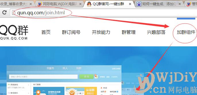 第一步:打开QQ官方网站:http://qun.qq.com/join.html 首页导航栏就可以看见‘加群组件’如下图: