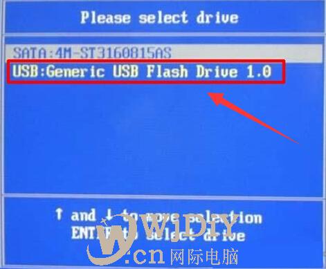 2.接着,进入到启动选项界面,可以看到其中有一个USB:选项,这就是我们插入的U盘,将光标移动到该选项上,按下回车键,随后电腦将重启从U盘内启动。