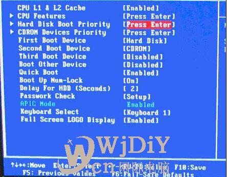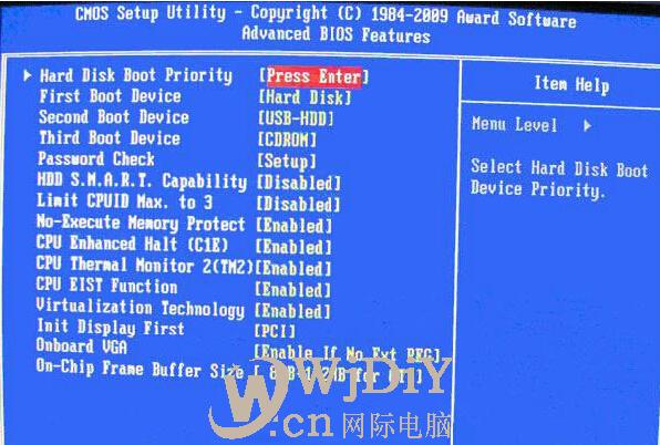 在进入高级BIOS设置(Advanced BIOS Features)界面后,首先要选择硬盘启动优先级:Hard Disk Boot Priority。