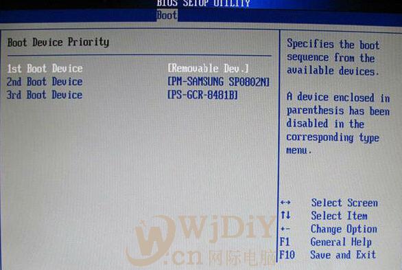 如果在图1-2的硬盘驱动器“Hard Disk Drives”里面没有将U盘作为第一启动设备,那么,在这里就不会存在和显示U盘,如上图2-2所示。但是,我们可以选择移动设备“Removable Dev.”来作为第一启动设备