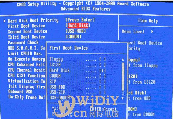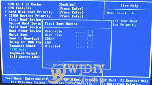 完成上一步后,再选择第一启动设备(First Boot Device):该版本的BIOS这里没有U盘的“USB-HDD”、“USB-ZIP”同类的选项,选择移动设备“Removable”也不能正常启动。但是,选择“Hard Disk”就可以启动电腦。