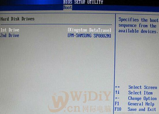 进入硬盘驱动器“Hard Disk Drives”界面,需要选择U盘作为第一启动设备“1st Drive”。如果之前在“Hard Disk Drives”里已经选择U盘为第一启动设备,如图3-2所示,那么在这个界面里就会显示有U盘,我们就可以选择U盘作为第一启动设备,如图
