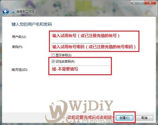 第七步:填写你在网站上注册的用户名和密码,点击创建(如图)