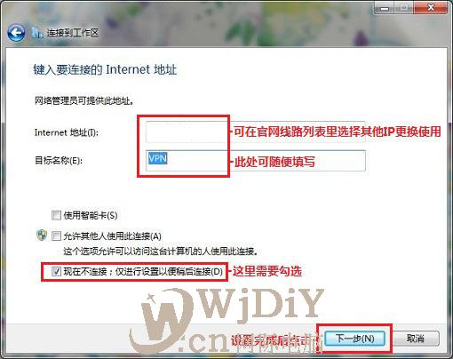 第六步:Internet地址栏填写ip地址(服务器地址登陆会员中心查看)目标名称填写:vpn(也可以随便填写),勾选-现在不连接,仅进行设置以便稍后连接点击下一步(如图)
