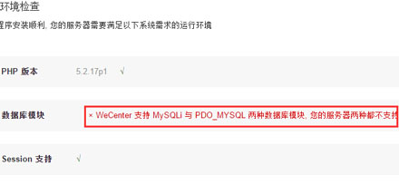 使用 WeCenter 安装程序, WeCenter 是中国首个基于 PHP + MYSQL 开发的开源化社交问答社区;安装时报错:WeCenter 支持 MySQLi 与 PDO_MYSQL 两种数据库模块, 您的服务器两种都不支持 如下图