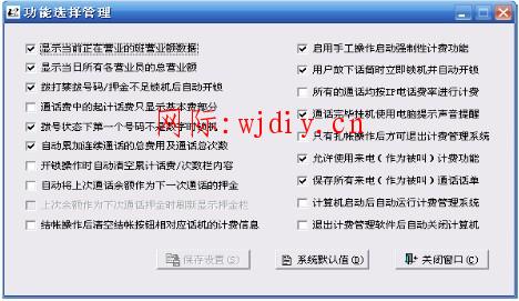 为了适应不同用户的不同功能需求,本计费管理系统提供了的一系列功能选项,各用户可根据实际的功能需求来进行相应的设置。同样为了系统的安全起见,只有操作级别属于系统管理员及以上级别的操作用户方能进行这一操作。以系统管理员登录后单击主窗口界面上的“功能选择”命令按钮,进入功能选择操作,屏幕上显示的功能设置界面如