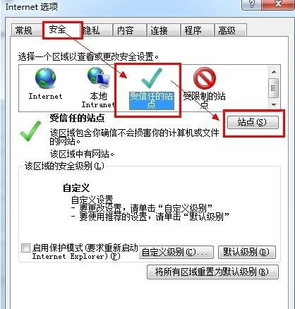 步骤2:在“站点”里添加你所需要信任并打开的网站站点,并点击确定。操作如下图: