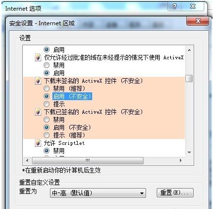 如果以上设置还是不行,说明浏览器是有点问题了,不过再按下面来设置下应该是没问题的。继续打开internet选项-》安全—》自定义级别,把里面的所有Activex选项里都启用。