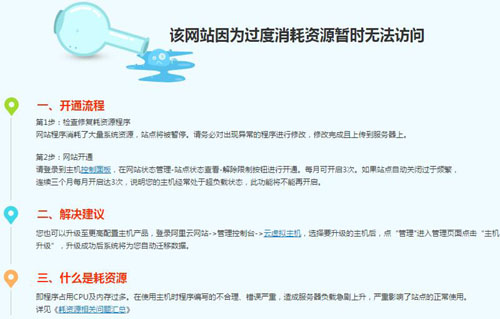 网站程序消耗了大量系统资源,站点将被暂停。请务必对出现异常的程序进行修改,修改完成且上传到服务器上。
