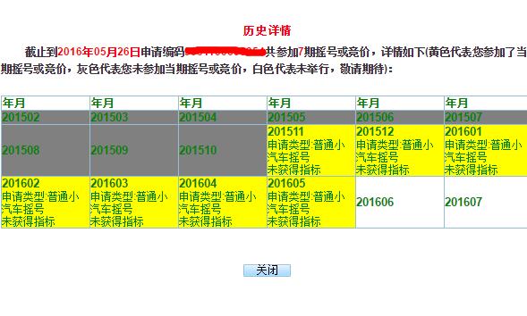 深圳摇号截止到2016年05月26日申请编码9061100XXXXXX共参加7期摇号或竞价,详情如下(黄色代表您参加了当期摇号或竞价,灰色代表您未参加当期摇号或竞价,白色代表未举行,网际电腦敬请期待):