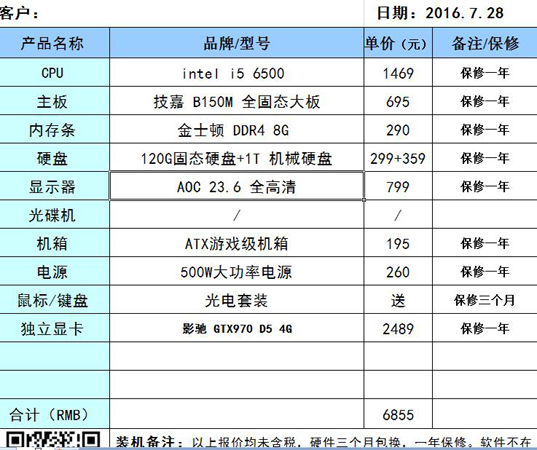 微信朋友叫我给推荐一款能玩守望先锋高画质的电腦,装机备注:以上报价均未含税,硬件三个月包换,一年保修。软件不在保修范围,保修方式为送修,不提供免费上门保修。 拆封不保,上门服务50元起! (以上配件可选择性调换及更改重新计价)