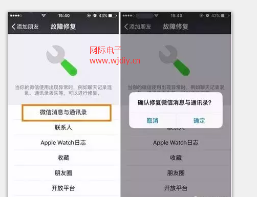 输入成功后,点击搜索,搜索到后进入到“故障修复”界面,然后选择“微信消息与通讯录”在弹出“确认修复微信消息与通讯录”窗口时,点击确认,然后你就可以就看到界面显示“修复中,请等待”。当看到界面显示修复完毕之后,你只需要跟着微信提示的步骤选择“强制关闭”就行啦。然后就会自动跳到桌面,这时你关闭你的微信,重启下,当你重新打开微信的时候,微信会自动加载已经恢复的资料。当数据载入完毕后,你丢失的微信聊天记录和通讯录都会恢复啦。不过网际在此提醒大家,这种情况只能处理是微信出现异常时导致数据的迷失,但是你手动删除的,这种方法不可行的。