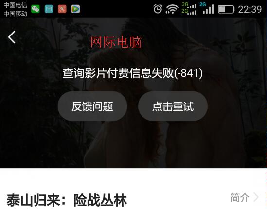 这几天想看电影就冲了3 个月腾讯视频会员;电腦进入可以看, 在手机APP上看就会报错:查询影片付费信息失败(-841);从网上找了一下怎么处理!如下提示图: