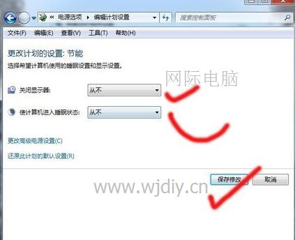 5.分别将关闭显示器的时间设为从不,电脑进入休眠状态的时间也设为从不