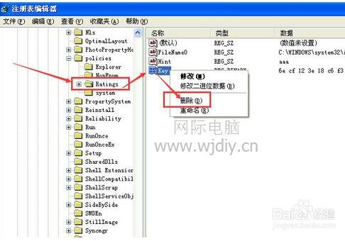 第七步:在点开的“Ratings”右侧窗口中找到“Key”上点击鼠标右键---->删除。