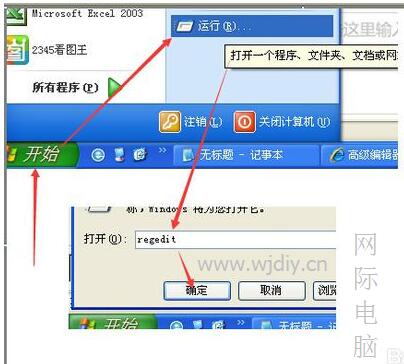 第一步:点击开始--->运行--->regedit