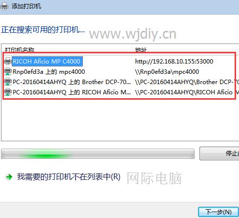 在弹出的添加打印机搜索的共享打印机;选择下一步就可以了