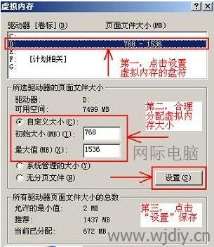 虚拟内存的设定主要根据你的物理内存大小和电腦的用途来设定,在桌面上用鼠标右击“我的电腦”,选择“属性”,就可以看到内存了。根据微软公司的建议,虚拟内存设为物理内存容量的1.5--3倍,例如512MB的内存,虚拟内存设定为768--1536MB;1G的内存,虚拟内存设定为1536--3072MB。也可让Windows来自动分配管理虚拟内存,它能根据实际内存的使用情况,动态调整虚拟内存的大小。在虚拟内存设置页面下方有一个推荐数值,如果确实不知道设置多少为最佳,建议虚拟内存就设为推荐的数值。虚拟内存有初始大小与最大值两个数值,最好把初始大小和最大值设为相同,以避免系统频繁改变页面文件的大小,影响电腦运行。内存容量2GB或以上的,如果不运行大型文件或游戏,也可以关闭虚拟内存。