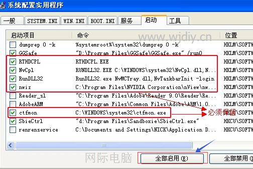 首先,通过点击“开始”,“运行”,输入“msconfig”回车,打开“系统配置实用程序”。选择“启动”标签页,在下面的启动信息中,除了ctfmon.exe、rundll32.exe,显卡驱动,声卡驱动必须保留之外,其他的第三方程序都是可以禁用的,可以参照下图进行更改。