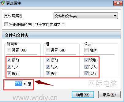 第3步、接着按下图进行设置,最后点确定,这样 ./templates 目录以及下面的子目录和文件都被设置为0777了。