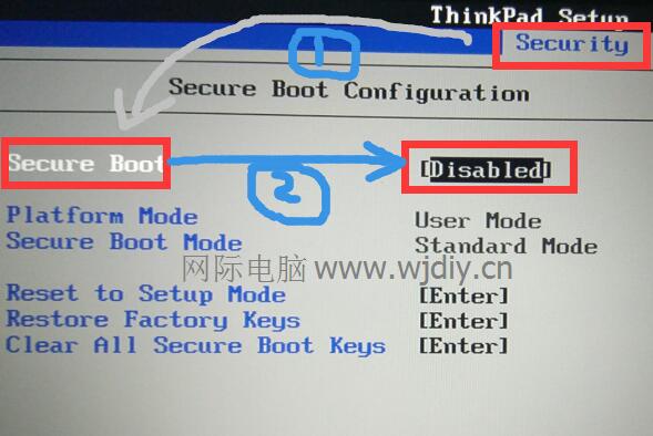 1、重启笔记本按F10或F2进入BIOS设置,按→方向键移动到Security,将secure boot改成disabled,关闭安全启动,如下图所示;关闭secure boot