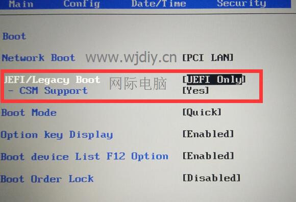 csm support选择yes uefi only 不用变 本人用的是uefi+gpt安装的win7 x64