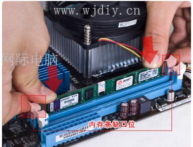 1,内存条缺口对准插槽的凸起,向下插紧;2,两侧的卡扣,向内卡住,即可安装好内存条;如下图: