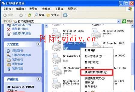 在“打印机和传真”窗口中,右键点击您使用的打印机图标,选择“使用联机打印机”菜单项。如图 1 使用联机打印机所示: